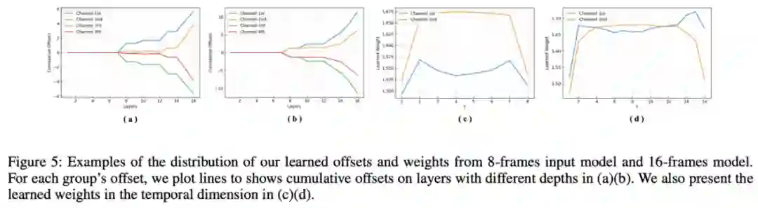 我们认为浅层的神经网络主要学习 2D 空间特征,在较深的网络中才开始逐渐学习时序维度特征,这和之前 3D 卷积网络中得到的结论是类似的。