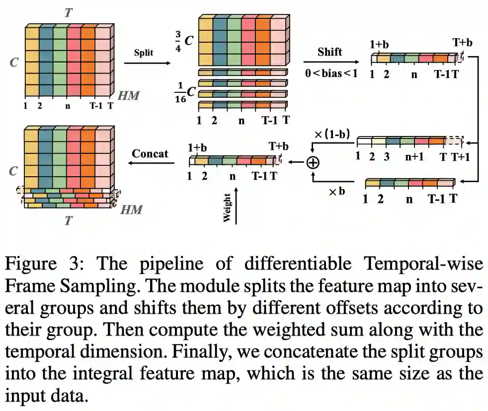 可微时序移动模块的框架如图三所示,它可以将各组按 channel 维度切分出来的特征沿着时间维度移动任意个单位。其实现方式主要是通过一维线性差值实现的。其中我们还采用了时序扩展技术,以保证偏移之后位于视频之外的特征不为空。