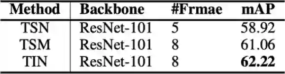 表一对比了在 Something-Something v1 数据集上 TIN 与其他主流模型的性能。在测试性能时每个视频均只采用 1 Crop 进行测试,且分辨率和训练时保持一致。