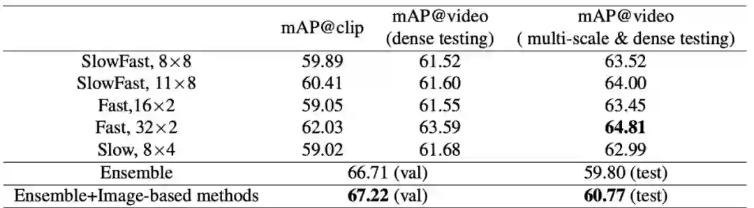 结果下表所示,时域密集的 fast 分支(32*2)取得了最高的单模型成绩。我们还发现,测试阶段的多尺度以及密集采样可以大幅提高算法性能。