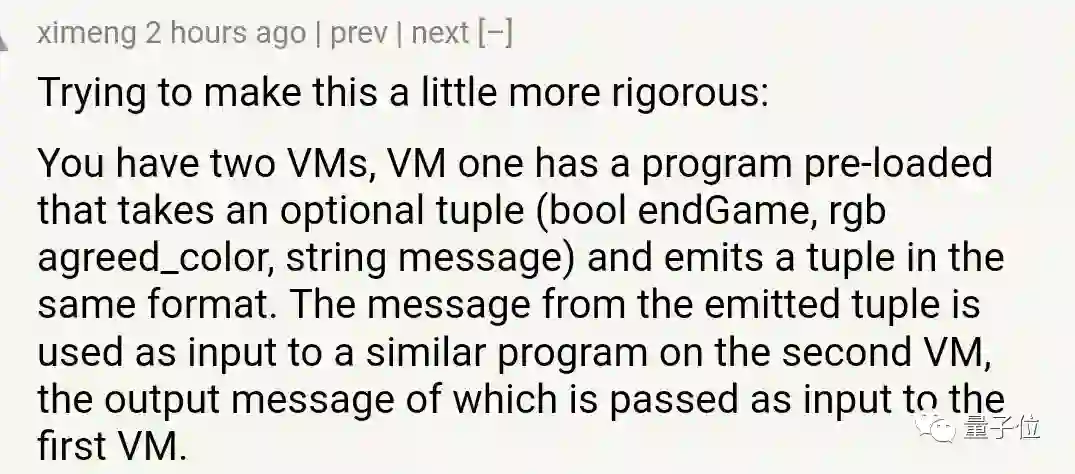 将参赛者转化为一个虚拟机(VM),拥有元组(bool endGame, rgb agreed_color, string message),VM1的这一消息组将作为输入发送给VM2。