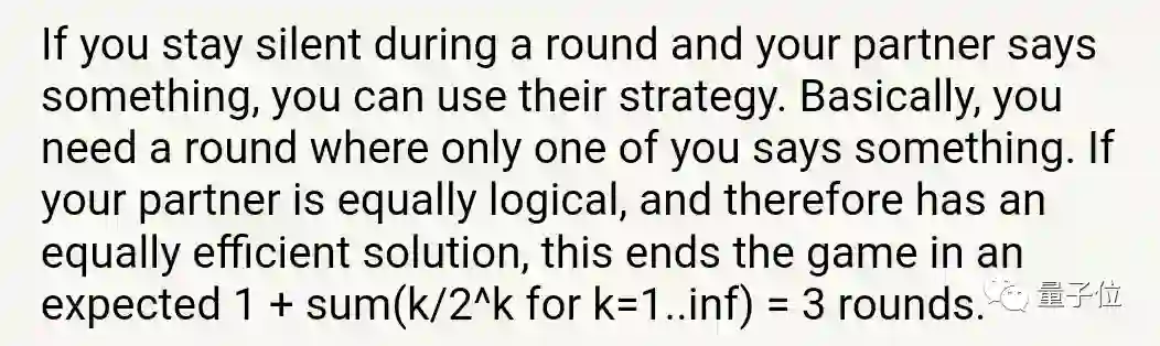 也就是说,他认为在这一谜题中,最重要的是保持“每一轮只有一人执行说话”。如果队友也赞同这一逻辑,那么很快就能结束比赛。