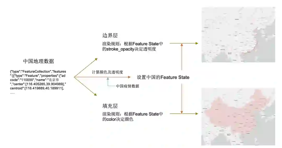 前端渲染有其内在逻辑和流程,以图九中国地理数据为例,数据源包含了区域等特征。基于数据源地图组件会分为不同的层,每层依据不同的渲染规则负责渲染不同的内容。