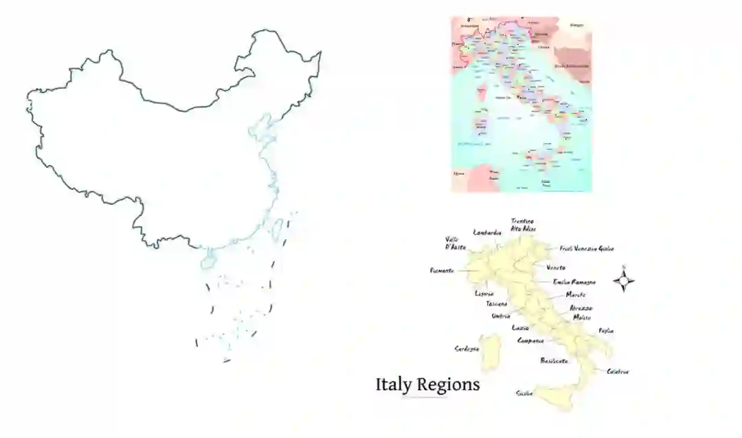 在地理数据的来源上,知识疫图国内和国外分别采集了阿里云、Natural Earth两大数据源。在收集到数据之后,进行地区字段的匹配如Beijing–China|Beijing–北京市,繁体简体转换,中英文对照等地区ID重组工作。虽然Natural Earth有数据完整性等优点,但其数据还存在一些细节需要修正(如图六)。中国地区的修正,主要指九段线、南海诸岛、台湾省、藏南地区等边界线和描述的处理。其他世界地区的数据调整包括(1)区域的重新规划比如意大利、法国等国家,需要以国家-大区-省方式重新合并和调整;(2)更粒度的数据处理比如英国苏格兰、北爱尔兰需要细化出像英格兰一样郡级的数据。