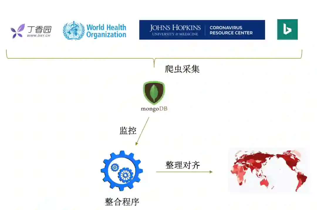 要想打造好疫情地图,基础工作是疫情数据的采集与整合。在疫情数据的收集过程中,知识疫图整理了丁香园、WHO、约翰·霍普金斯大学、必应等国内外多个平台的数据源,这些数据对于不同地区疫情有不同力度、不同准确度的描述。多样的数据源,不仅可以使数据更细粒度,而且保证了数据的完整性和准确性。