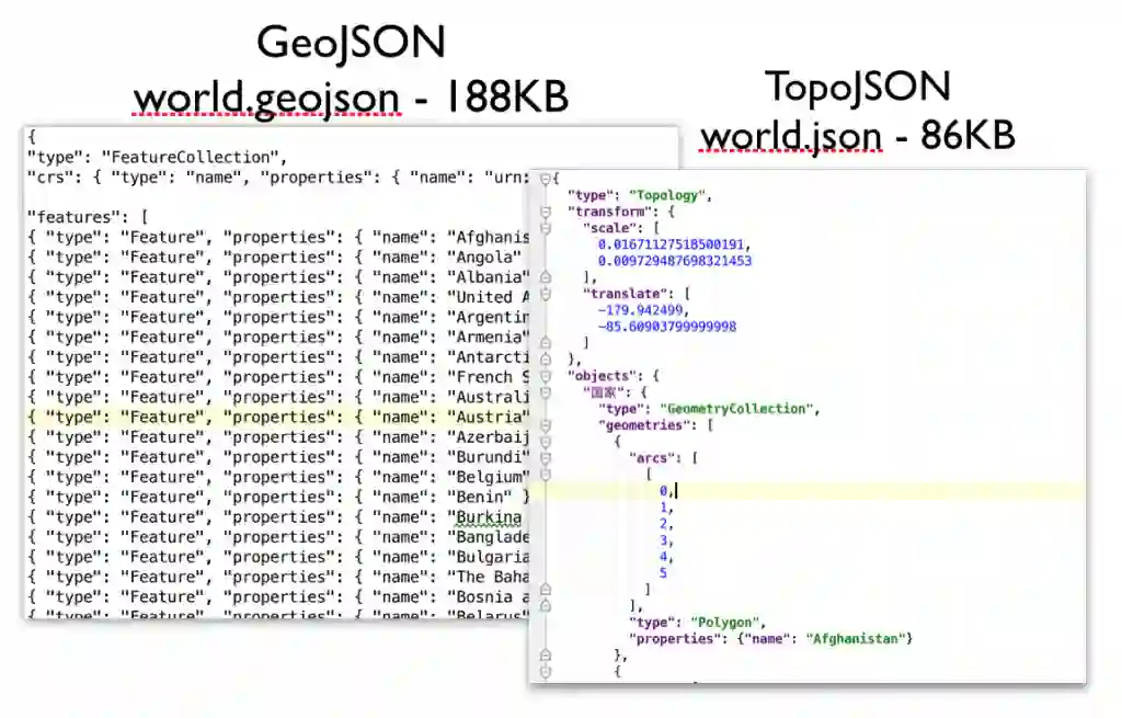 Gzip可以理解成对于传输的内容做了压缩,现在在网络传输上Gzip算是一种常用的压缩方法,其实就是把这个功能在后端启用起来,算是一个小技巧。Json文件主要是从Geojson到Topojson会有一个比较大的提升,简单地说Topojson减少了重复内容的开销,尤其是像地图边界线这种,经常不同国家会公用同一段边界线,在Geojson里就会需要对这段边界线声明多次,但是Topojson里一次就可以搞定。