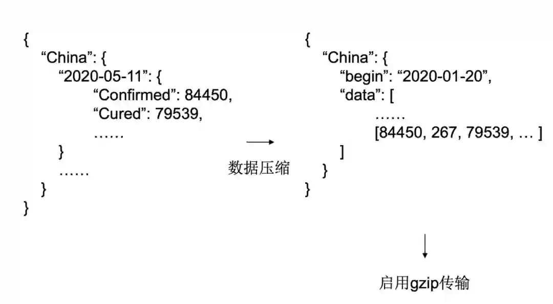 如图一所示,针对不同数据源的更新特点,知识疫图运用了不同的采集方式,并将采集到的数据集合于一个数据库中,通过整合程序进行监控,整理对齐以便后续前端使用。图二是其中整合程序包含的具体工作,示例了其对数据对照、合并、补充、纠正四个方面的处理。数据整合后的数据库由于数据过大,不利于传输,对此研究人员采用了如图三的数据压缩方式,大大削减了字段不必要的开销。