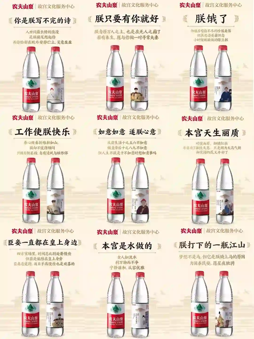 故宫和农夫山泉合作的9款矿泉水,骚操作全在文案上。