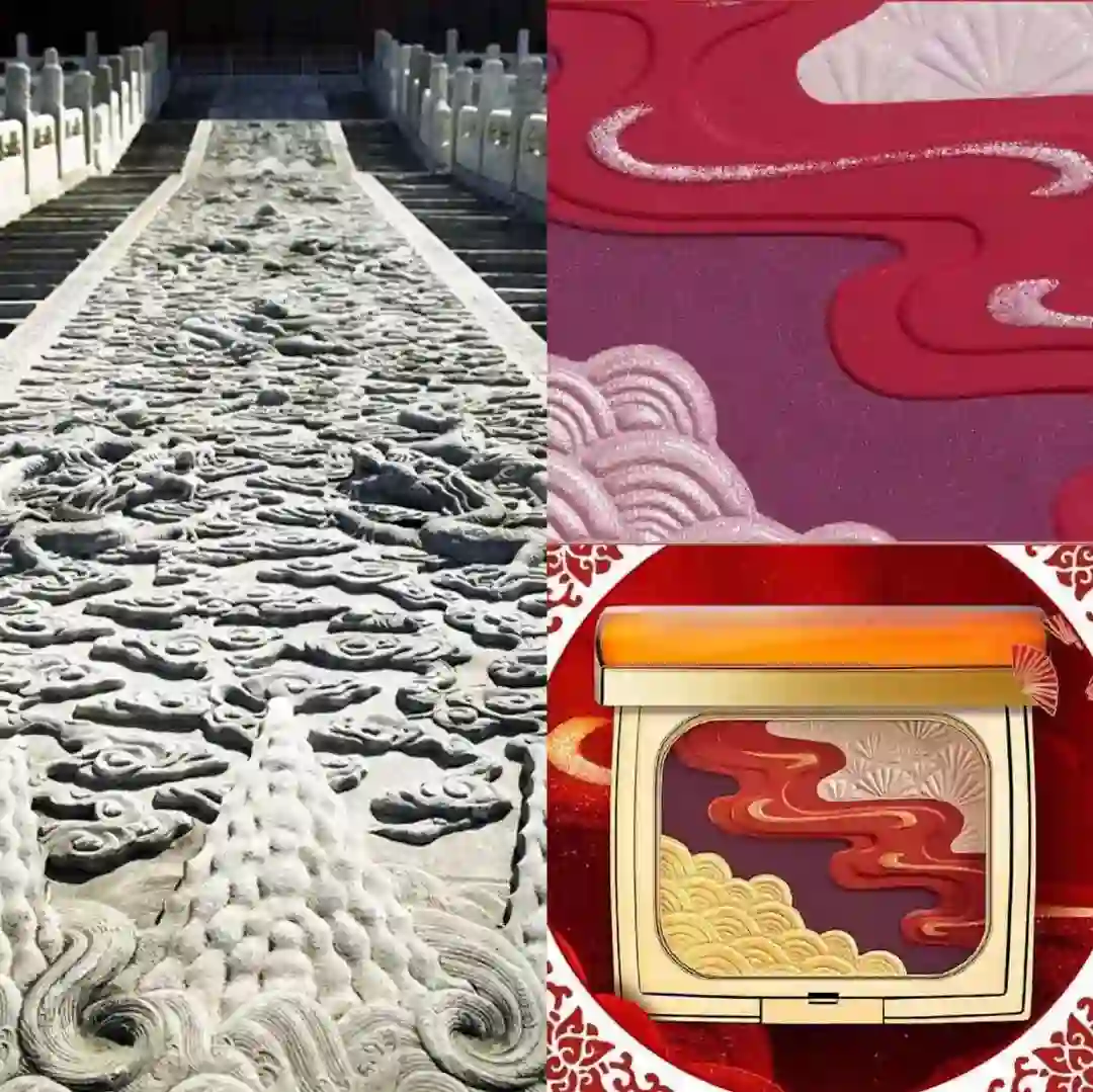 眼影盘的设计灵感来自于紫禁城的御道,石阶上的云霞、松针纹、水纹被复刻进了这小小的一盘。