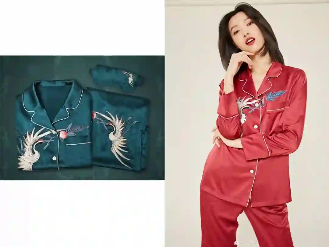 设计的灵感来自于畅音阁天花中的仙鹤和蝙蝠纹样,结合乾隆时期的戏服,取「蝠福服如意,鹤贺合佳音之意」。价格也很感人,丝绸薄款499一套,桑蚕丝真丝的1999一套。