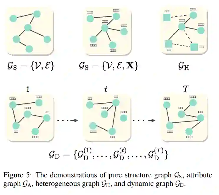 如图5所示,现有深度图聚类方法的输入图分为纯结构图、属性图、异构图和动态图四种类型。这些图类型的定义表述如下。