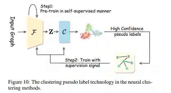 深度图聚类中的聚类方法旨在以无监督的方式将学习到的节点嵌入到不同的聚类中。它们可以分为两类:传统聚类和神经聚类。