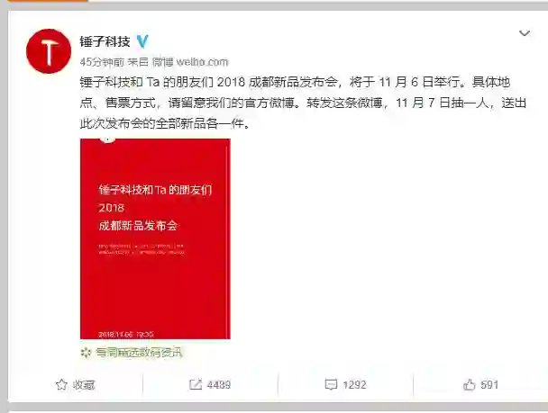 10月17日,锤子科技在微博宣布:11月6日将在成都举行新品发布会,具体地点、售票方式待定。此前,有微博用户发布消息称,锤子科技解散成都分公司。但锤子科技表示,公司经营状况良好,各项业务正常开展。