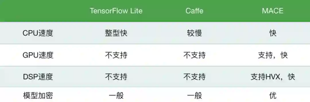 MACE 项目目前能够支持主流的移动端 GPU,但是由于开源时间较短,还需要时间经过业界的检验。除此之外,模型保护是设备端部署的一大需求,而目前只有 NCNN 和 MACE 在该方面有支持,NCNN 支持将模型转为二进制去除符号,MACE 支持将模型转为 C++ 代码来实现模型保护。