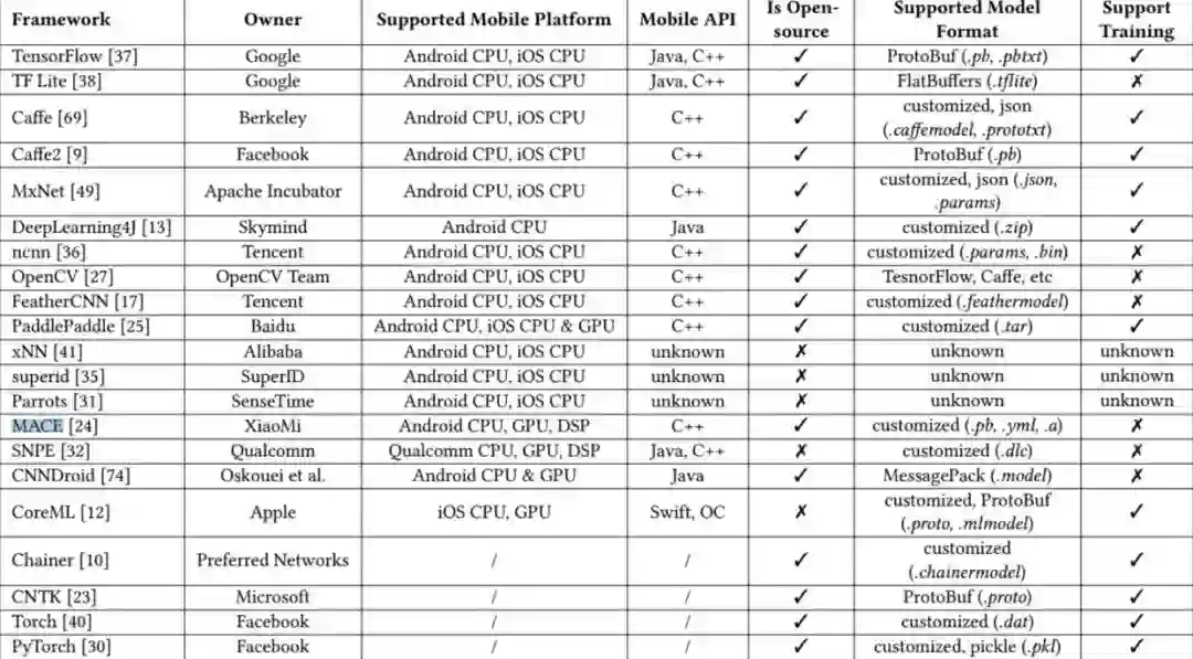 具体来说,TFLite 背靠 TensorFlow 庞大而且完善的生态,借助 Google 自身的技术影响力,目前在业界应该是应用最广泛的了,TFLite 目前侧重于 CPU 端模型量化的支持,对于 GPU 等其他加速设备均不支持。Caffe/Caffe2 包含训练和预测,因此在集成和使用上会比较便利,但是整个框架会比较臃肿并且针对设备端的优化相较于其他框架会少一些。