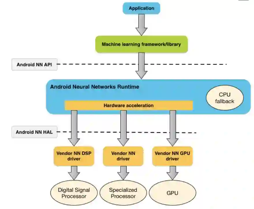 Google 为 Android 8.1 以上版本设计了 Neural Networks API (NNAPI) 以方便机器学习框架获得底层硬件的加速能力。NNAPI 基于硬件厂商提供的 GPU、DSP 或 AI 专用芯片(如 NPU)等的具体实现以加速 AI 算子,否则会回退到 CPU 上执行。在此之前各家硬件厂商提供的 SDK 只能运行在自己的芯片上,这使得开发者需要在不同的设备上集成不同的 SDK,或者是干脆放弃某些平台而只采用 CPU。有了 NNAPI 就可以在不同的设备上采用统一的接口调用,AI 任务就可以调度到最适合的硬件处理器上运行。但是 NNAPI 依赖于芯片厂商提供驱动。例如高通为 OEM 提供对 Adreno GPU 和 Hexagon DSP 的支持,华为提供对 NPU 的支持。但总体来说目前只有少部分手机提供 NNAPI 驱动,而且部分驱动对 NNAPI 的支持也并不完整。