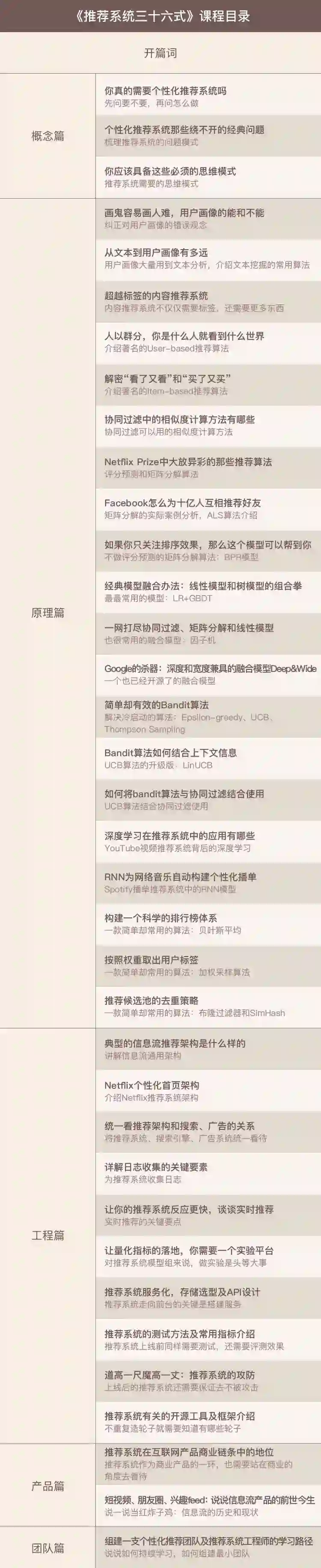 ,几乎涵盖了推荐系统的全部核心知识点,可以帮你建立起对推荐系统的全面认知。
