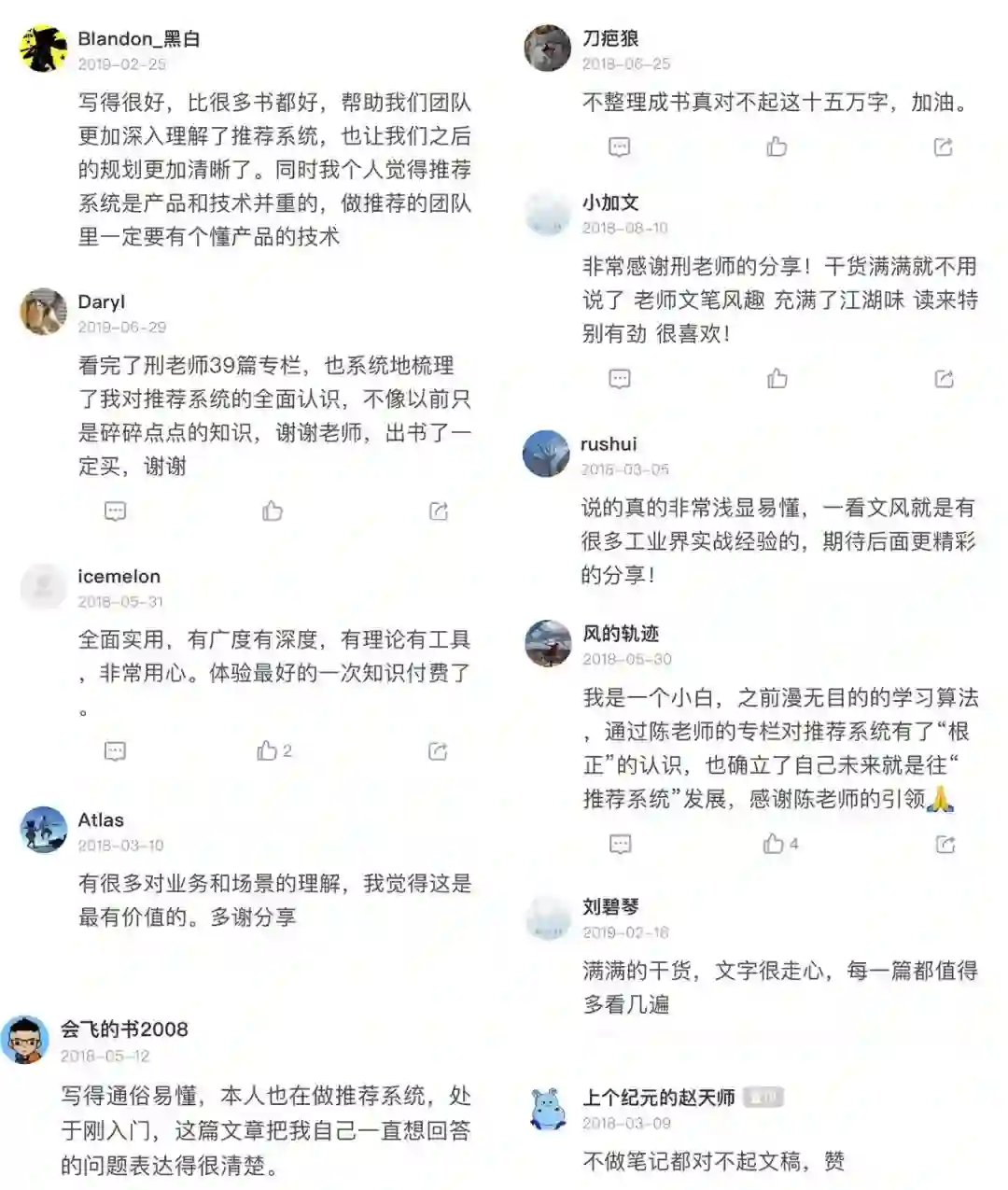 在专栏中,他从 5 大模块出发,梳理了完整的推荐系统知识脉络,精讲了 20 个推荐系统算法原理和 10 大算法落地事件案例,帮你彻底掌握推荐系统。另外,推荐系统要成功,除了技术以外,还要考虑产品理念和商业价值,这部分是专栏里独家分享的内容,也是非常有前瞻性了,这里推荐给你。