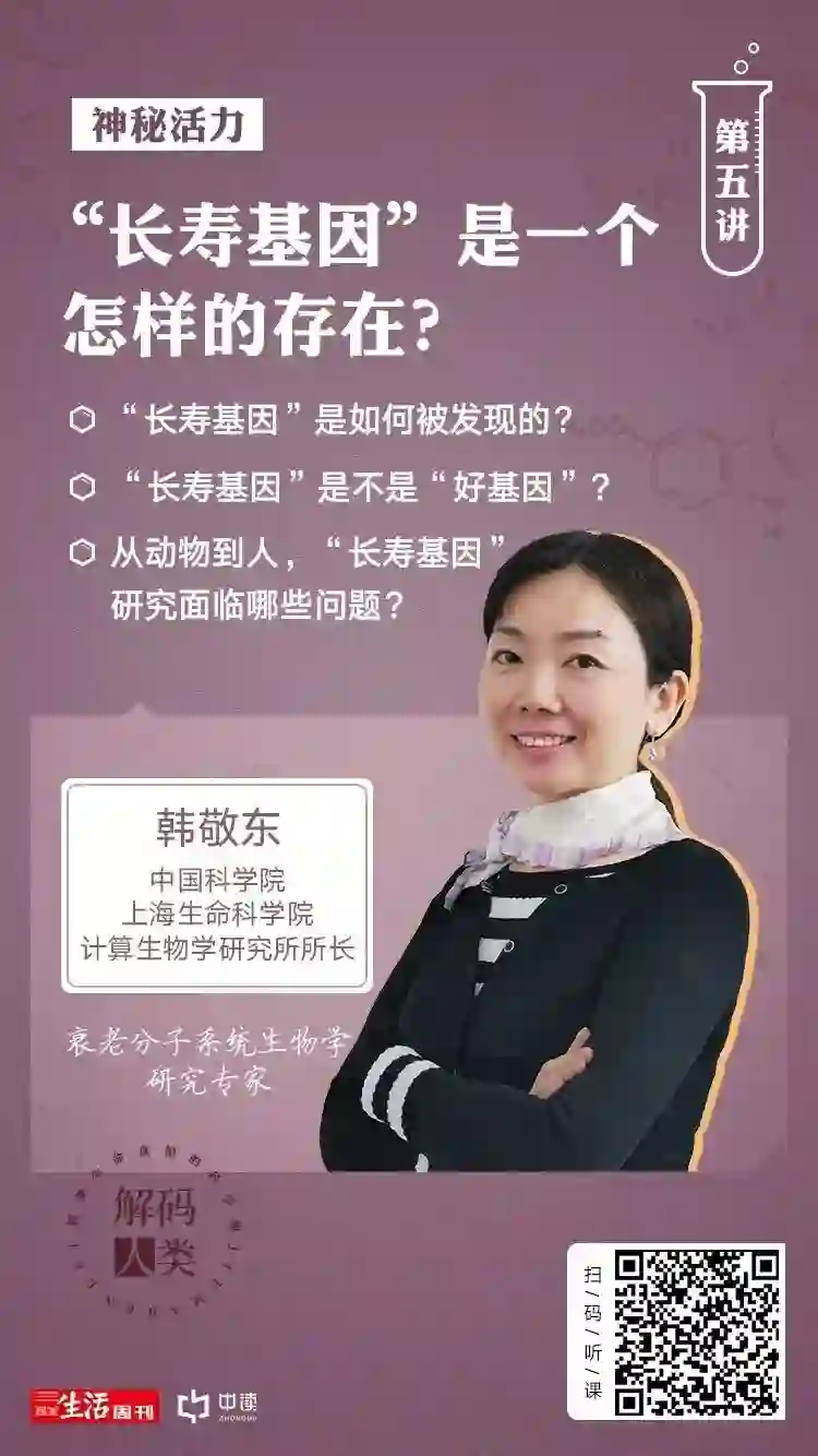 中国科学院上海生命科学院计算生物学研究所所长韩敬东,长期研究衰老的系统生物学。在这一讲,她将为你揭秘神奇的“长寿基因”,以及通过3D人脸识别生物年龄等最前沿的科技成果。
