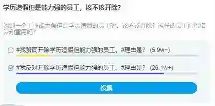 参与的“是否开除学历造假但能力强的员工”投票中,竟有