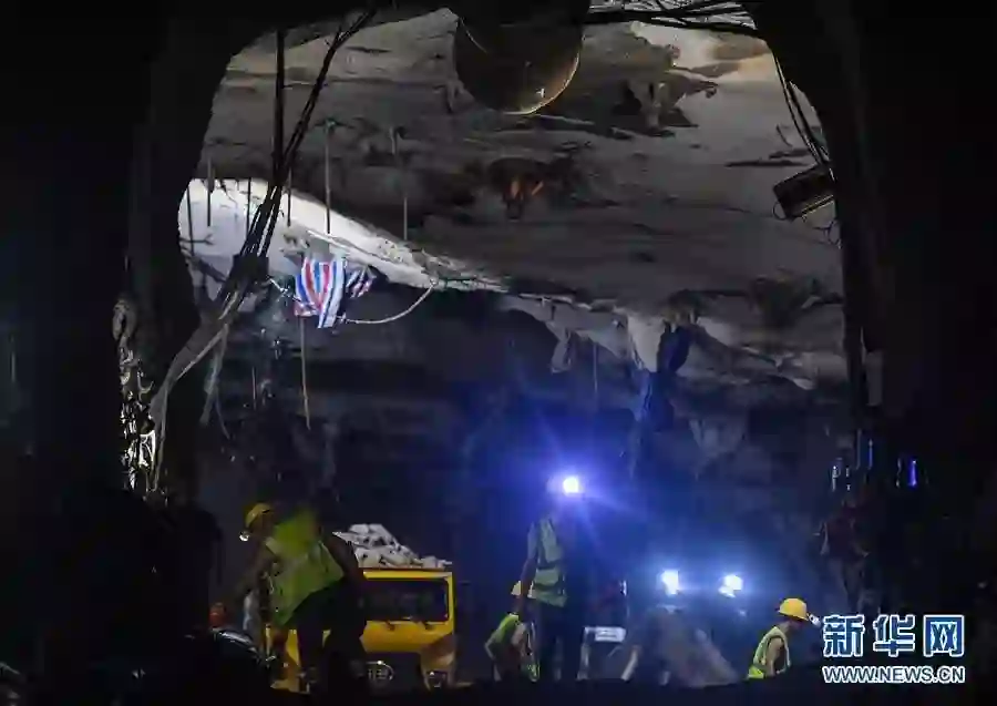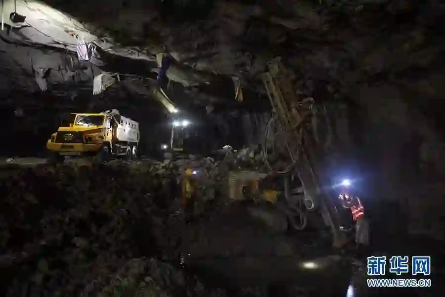 中国水电六局工程人员在700米深的江门中微子实验地下实验室进行中导洞施工(6月23日摄)。新华社记者 刘大伟 摄