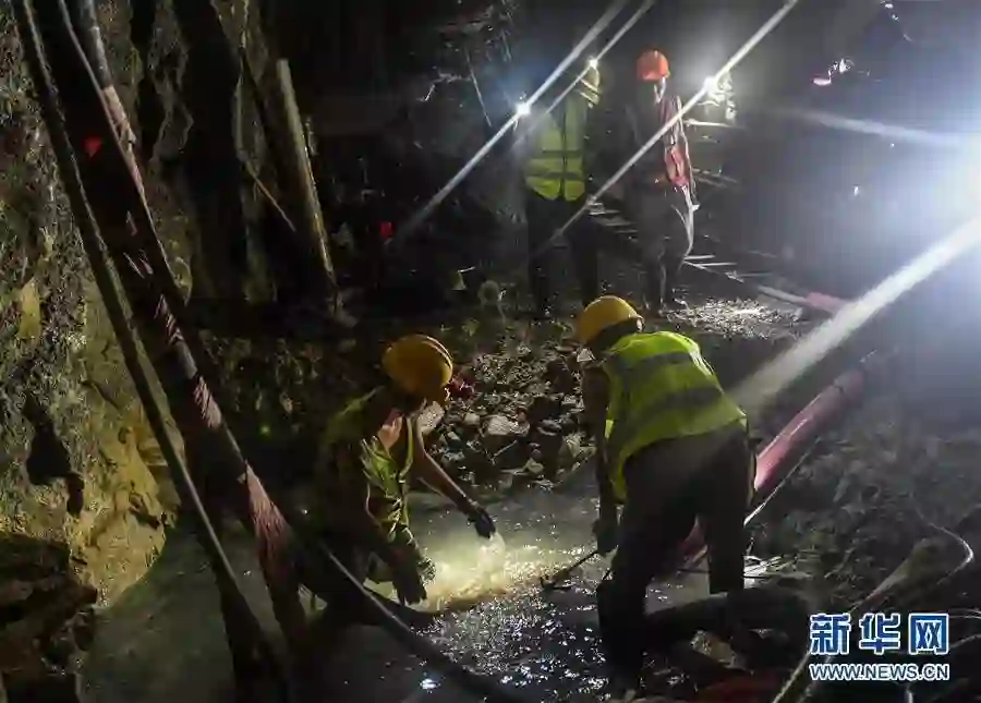 中国水电六局工程人员在700米深的江门中微子实验地下实验室排水廊道进行施工(6月23日摄)。 新华社记者 刘大伟 摄