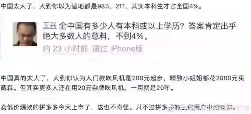 网上一张大家都在转发的图,说的是直到现在中国的本科生及以上学历群体,只占这个社会总人数的4%(又说6%),这里还没区分三本、二本、211、985。