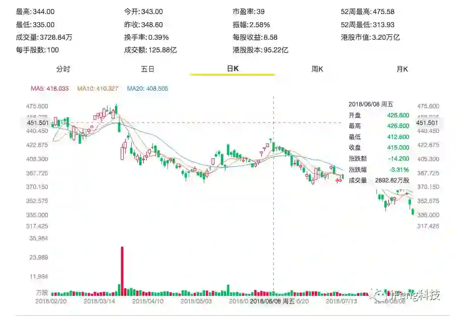 今年初腾讯的股价达到历史高点的475.72港元,不过在过去的半年中,腾讯的股价只能用“跌跌不休”来形容。截止8月15日发布财报的当天,腾讯股价收于336港元,较高峰时期下跌139.72港元。