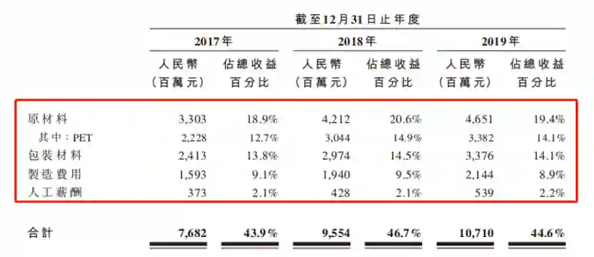 除却水这一直接成本,农夫山泉的主要原材料为生产产品瓶身的PET(涤纶树脂)、糖、果汁等,2017-2019年,该部分成本占到了销售成本总额的43.0%、44.1%和43.4%。另外,包括纸箱、标签及收缩膜等在内的包装材料,在2017-2019年分别占销售成本总额的31.4%、31.1%及31.5%。