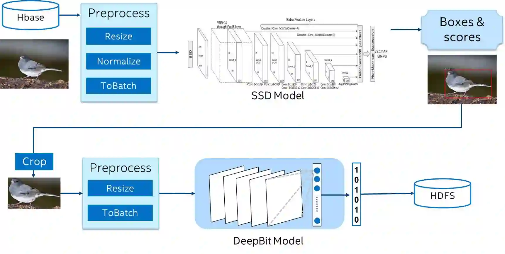 ♦ 使用BigDL加载DeepBit模型,通过Spark对检测到的目标图片进行分布式特征提取,得到对应的特征