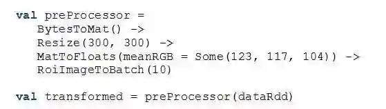 这个样例的预处理流水线将一个原始RDD通过一系列的转换,转成一个Batch的RDD。其中,ByteToMat把Byte图片转换成OpenCV的Mat存储格式,Resize将图片的调整为300x300的大小,MatToFloats将Mat里的像素存成Float数组的格式,并减去对应通道的均值。最后,RoiImageToBatch把数据组成Batch,作为模型的输入,用于预测或训练。