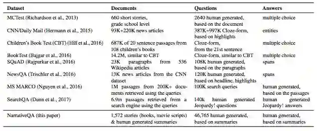 在NarrativeQA之前,也有很多用于训练阅读理解模型的数据集,例如MCTest、CNN/Daliy Mail、CBT、BookTest、SQuAD、NewsQA、MS MARCO以及SearchQA等。下表就展示了这几种数据集的基本情况和主要特点。