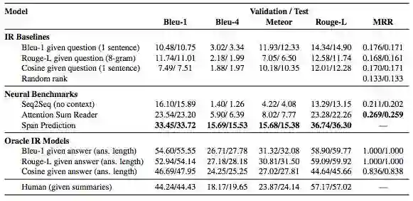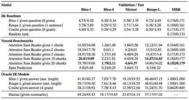 首先,阅读摘要与之前的阅读理解任务相似,其问题是根据上下文构建的。但是,有关故事情节的摘要往往包含更复杂的时间线和更多的人物。在这个意义上,阅读有情节的摘要往往要比维基百科的新闻文章或段落摘要难一些。结果如下: