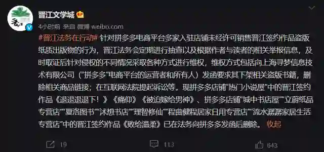 晋江文学城指控拼多多销售盗版书 将进行维权