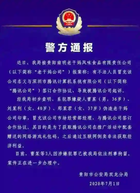 贵阳警方通报,3人伪造老干妈印章与腾讯签订合同,已被刑拘;此前,腾讯状告老干妈欠广告费,老干妈称腾讯遭遇诈骗。