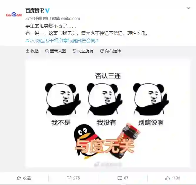 36氪获悉,就网传“腾讯状告老干妈拖欠广告费提及某搜索引擎”一事,百度7月1日下午发布微博称,“手里的瓜突然不香了……有一说一,这事与我无关。请大家不传谣不信谣,理性吃瓜。”