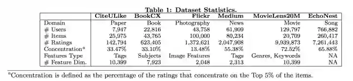 其中Concentration表示了评分集中在Top 5%物品的比例,可以反映该数据集对于热门物品的偏爱程度,与用户个性化物品偏爱程度。