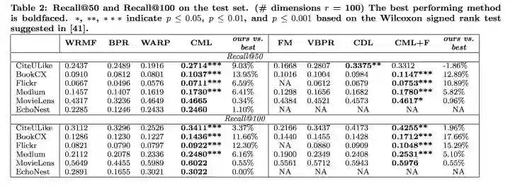 并且CML方法在对于注重用户兴趣的数据集上比较好,说明CML能很好的发现用户的preference。