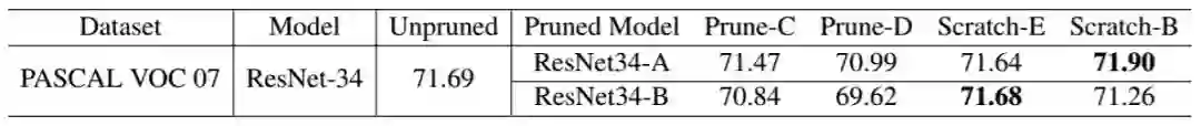 表 7:剪枝在检测任务上的(mAP)结果。剪枝后的模型来自于 Li et al. (2017)。Prune-C 指在分类预训练权重上剪枝,Prune-D 指在迁移至检测任务之后的权重上进行剪枝。Scratch-E/B 表示从头开始在分类任务上预训练剪枝后的模型,然后迁移至检测任务。