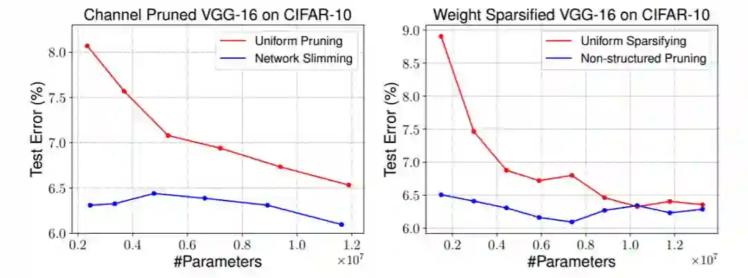 图 3:不同方法的剪枝后架构,所有模型都是从头训练的,平均运行 5 次。自动剪枝方法(左:Network Slimming (Liu et al., 2017),右:非结构化剪枝 (Han et al., 2015))获得的架构比在整个网络中均匀修剪通道或稀疏权重的方法具备更高的参数效率。