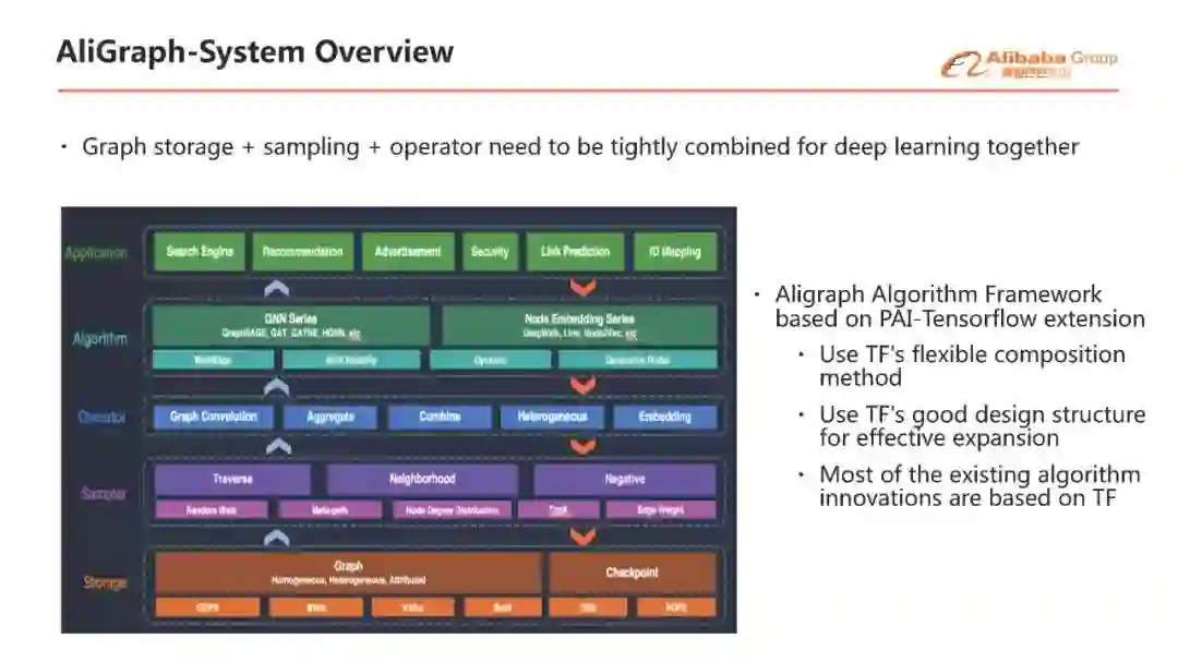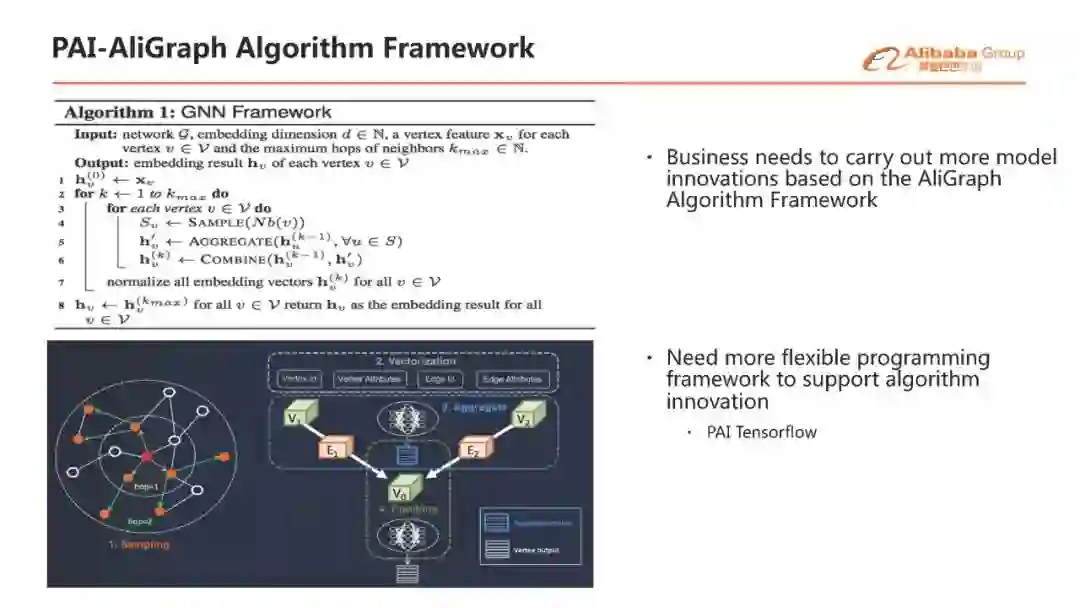 另一方面,工业场景中的Graph数据十分复杂,而且数据量巨大。平台不能脱离场景而独立存在,必须以业务为驱动,才最可能孵化出有实际价值的产品。以阿里巴巴的电商推荐场景为例,每天的产生的图数据多达几百TB,而且高度异构(多种类型的顶点、多种类型的边),顶点和边具有丰富的属性,诸如商品的名称、类目、价格区间,甚至是其关联的图像、视频等,这些属性以明文存在而非已经向量化好的结构化信息。以这样的数据为输入,如何高效的进行GNN训练是一个非常有挑战的问题。如果使用数据预处理、预训练等手段把Graph数据结构化、向量化,会耗费大量的计算资源、存储资源和人力成本。真正对GNN开发者友好的平台,应该是端到端的,在一套IDE里,用户既可以操作复杂的Graph数据,又可以将数据与深度神经网络对接,自由编写上层模型。平台提供简单灵活的接口,满足GNN高速发展所需的可扩展性与生态的兼容性,和针对复杂的分布式环境的大规模与稳定性。