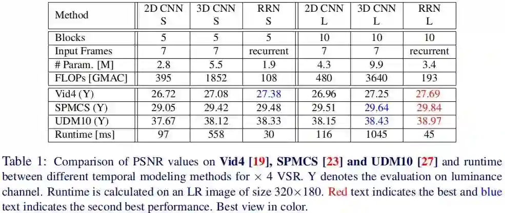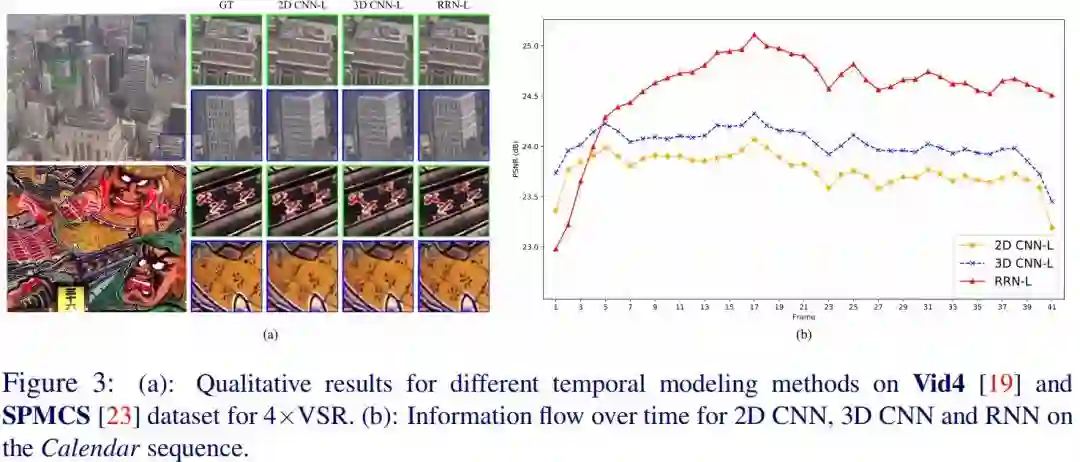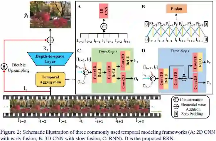 该文仔细研究并对了视频超分中的三种时序建模方案(2D-CNN, 3D-CNN, RNN),同时还提出了一种新颖的递归残差模块用于高效视频超分,其中残差学习用于稳定训练并提升超分性能。
