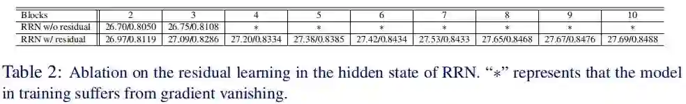 为更好说明RRN的有效性,作者还对比了不带残差学习时的性能对比,见下表。可以看到不添加残差学习存在严重的梯度消失问题。