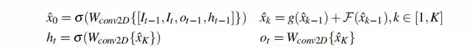为解决上述问题,作者提出了一种新颖的递归网络RRN(Residual Recurrent Network),它将残差学习思想引入到RNN中。这种设计确保了流畅的信息流,有助于保持长周期的纹理信息,进而使得RNN可以处理更长序列,同时降低了训练过程中的梯度消失风险。在t时刻,RNN采用如下方式生成隐状态与输出: