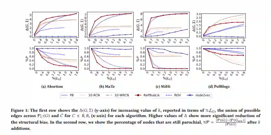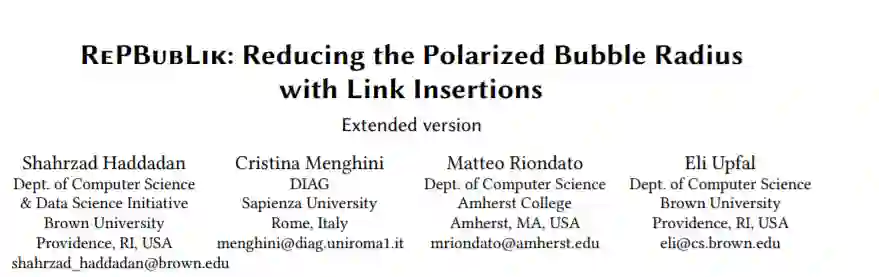 摘要:表达不同观点的页面之间的超链接图的拓扑结构可能会影响读者对各种内容的理解。结构性偏见可能会使读者陷入两极分化的泡沫中,而无法获得其他意见。我们将读者的行为建模为随机游走。如果从节点到另一观点的页面的随机游走的预期长度很大,则该节点处于极化泡沫中。图的结构偏差是高度极化的气泡半径的总和。我们研究了通过边插入来减少结构偏差的问题。在对数因子内很难治愈所有具有高极化气泡半径的节点,因此,我们着重于寻找插入的最佳 k 边以最大程度地减少结构偏差。我们介绍了RePBubLik,这是一种利用随机游走接近中心性的变体来选择要插入的边的算法。RePBubLik在温和条件下获得恒定因子近似值。它比现有的边推荐方法(包括一些旨在减少图极化的方法)更快地降低了结构偏差。