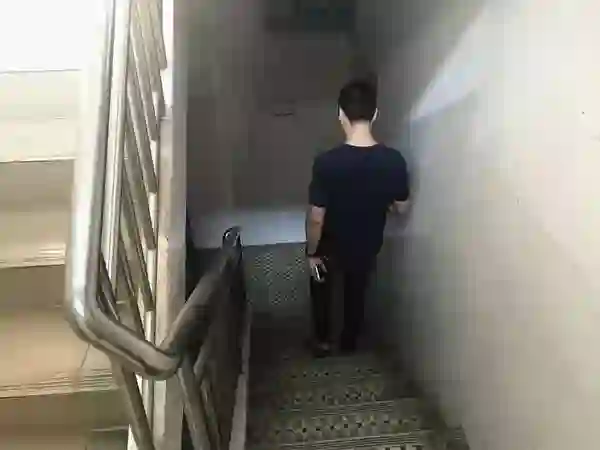 雷大同走在狭窄的出租屋楼道。 澎湃新闻记者 沈文迪 图