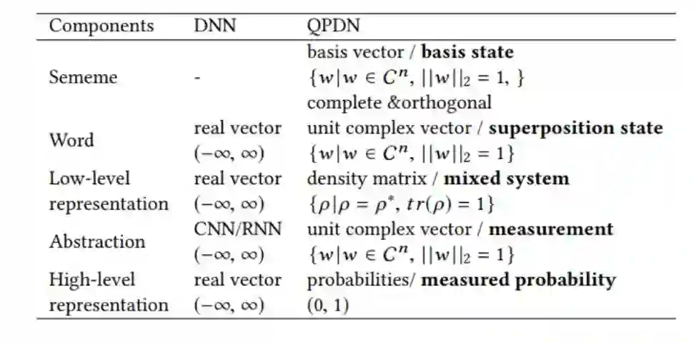 如图所示,词就像粒子一样(同时处于不同的位置,有一个波函数来描述它出现的不同地方的概率,但是义原是离散的,所以它实际上是一个离散的概率分布来描述),被认为是嵌入在希尔伯特空间的一个状态,也就是一个复数的单位状态向量,一个在基本语义单元空间的复值权重线性叠加(对应在基本语义单元的一个概率分布)。