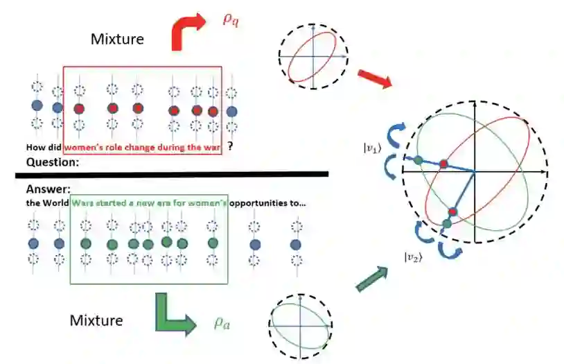 本文模型用滑动的窗口构建两个文本对象的 N-gram 的密度矩阵表示,然后采用一组测量投影操作,同时测量两个文本对象所有的 N-gram 窗口里的混合系统(由密度矩阵描述)。最后通过一组 max pooling 操作得到每个测量向量在所有 N-gram 最大的投影概率,最后通过向量的 cosine 距离得到匹配的分数。