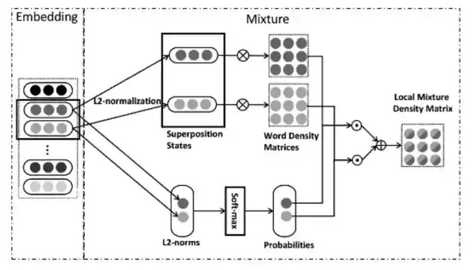 由于向量经过了归一化,得到的外积矩阵有着良好的性质,对角线元素是实数且和为 1,非对角线元素是复数。然后把所有外积矩阵加权起来得到的是一个密度矩阵,权重是由词向量的模经过 softmax 得到的一组和为 1 的向量,所以也能保证密度矩阵也是单位的(对角线元素和为 1)。其中一个好处是对网络对不同的词有着显式的权重,这样权重依赖于局部的上下文。