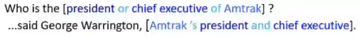 文句和答句同时包含了某个实体(president of chief executive of Amtrak 与 Amtrak’spresident and chief executive),但是它们的顺序有可能有一些颠倒,其中颠倒的本身会有一些词的变化,比如从 of 变成 ’s。